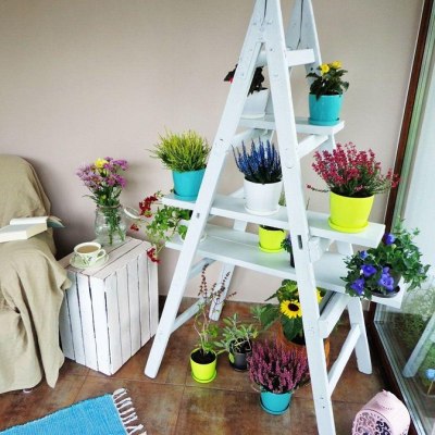Placing the plants on each of the distressed wood steps and then placing them in the corner of the room will save more space in your garden and still look beautiful. Add vintage ornaments to complete the look. Distressed wood ladder garden from architectureartdesigns.