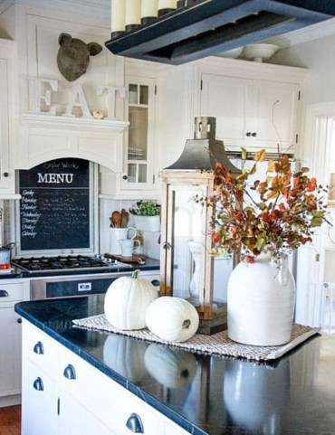 A stunning fall atmosphere in the kitchen with fall decor is a great way to create a warm feel in your kitchen. Choosing a soft white and gray color scheme can reinforce a warm impression in your farmhouse kitchen. Adding a touch of wood to furniture and floors can make a kitchen warmer than ever. The white pumpkin accents on the tray and dried leaves in this vase bring an autumn feel to the room. White and gray color scheme fall farmhouse kitchen from onekindesign.